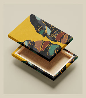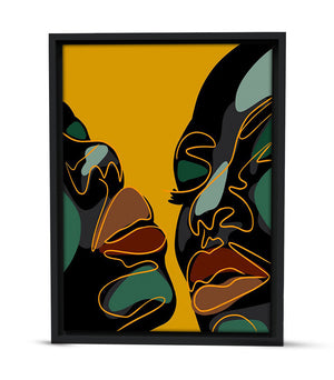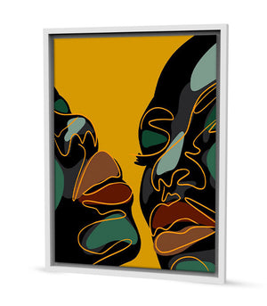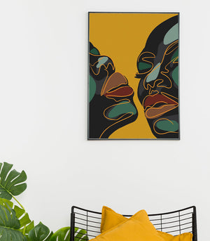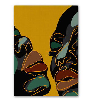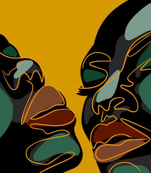 Description: Ce design illustre une conversation intime entre deux profils face à face, représentés de manière abstraite. Les lignes fluides et audacieuses en orange tracent les contours des visages, sur un fond de couleurs contrastées en jaune moutarde, vert forêt et brun terreux. L'œuvre évoque une harmonie de communication silencieuse, capturant l'essence d'un échange chargé d'émotion sans l'usage des mots.
