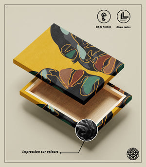 Chaque pièce est soigneusement imprimée sur du velours somptueux, offrant une texture et une profondeur exceptionnelles qui captivent le regard et invitent au toucher. Notre impression sur velours, novatrice et de haute qualité, apporte une dimension luxueuse et contemporaine à nos œuvres, créant ainsi une expérience visuelle inédite.