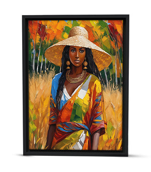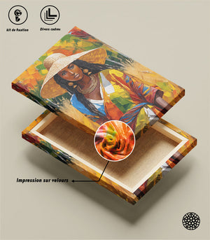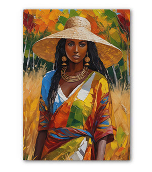 Incarnez la beauté et la sérénité de la nature dans votre espace avec "Élégance Champêtre". Cette œuvre d'art saisissante présente une figure féminine gracieuse, majestueusement drapée dans un pagne coloré, évoquant les riches traditions et la chaleur des terres ensoleillées.