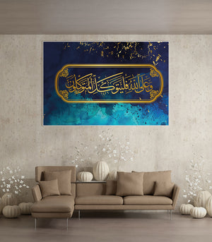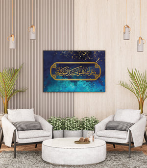 Ce tableau est un éloquent exemple de la calligraphie islamique traditionnelle présentée dans un ovale or éclatant sur un fond noir. La couleur dorée de la calligraphie contraste magnifiquement avec l'arrière-plan, lui conférant une présence lumineuse et presque sacrée. La forme ovale donne une sensation de complétude et de perfection, tandis que les motifs calligraphiques entrelacés illustrent la complexité et la profondeur de la langue arabe. C'est une œuvre qui pourrait servir de point focal méditatif dans n'importe quel espace, invitant à la réflexion et à l'appréciation de l'artisanat artistique.