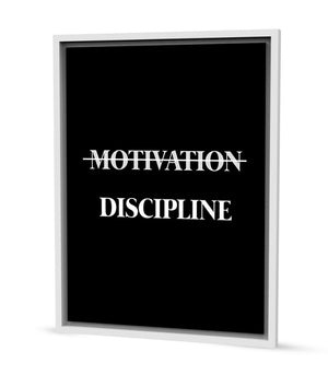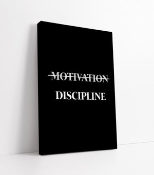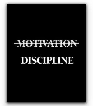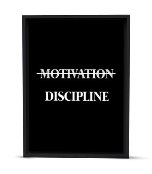 Un tableau minimaliste avec les mots "MOTIVATION" et "DISCIPLINE" en grandes lettres blanches sur un fond noir, offrant une touche d'élégance et d'inspiration.