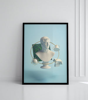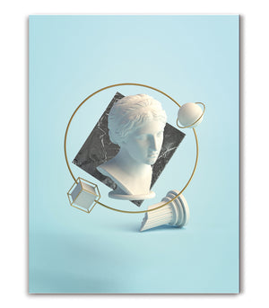 Ce tableau décoratif illustre un mélange captivant de textures et de formes géométriques, entourant un buste classique d'une élégance saisissante. Le contraste entre les tons pastel apaisants et les lignes dorées apporte une sophistication subtile à cette œuvre. Idéal pour sublimer un espace moderne ou traditionnel, ce tableau incarne l'équilibre entre passé et présent.