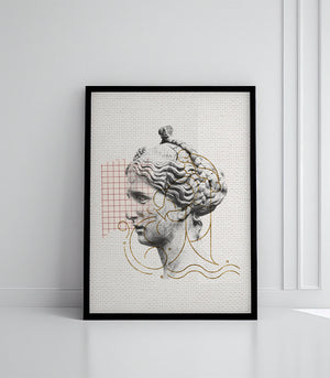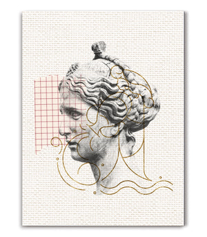 Apportez une touche d'élégance subtile à votre espace avec ce tableau minimaliste mêlant une statue classique et des motifs graphiques modernes. Les lignes dorées et le quadrillage rouge ajoutent une dimension contemporaine à ce design intemporel. Parfait pour une décoration épurée et raffinée, ce tableau offre une harmonie entre tradition et modernité.
