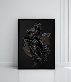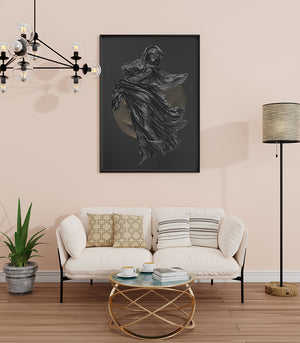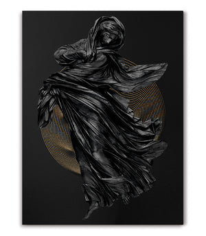 Ce tableau représente une sculpture drapée d'étoffes noires tourbillonnantes, rehaussée par un cercle doré en arrière-plan. L'œuvre évoque une grâce intemporelle et une énergie spirituelle captivante. Parfait pour apporter une touche dramatique et sophistiquée à votre intérieur.