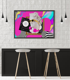 Plongez dans l'univers de la musique et de l'art avec ce tableau vibrant et audacieux. Associant un buste classique à des éléments modernes tels que des lunettes de soleil jaunes et une platine de DJ, cette œuvre mélange les époques avec humour et créativité. Idéal pour apporter une touche décalée et énergique à votre intérieur, ce tableau reflète une passion pour la musique et le design contemporain.