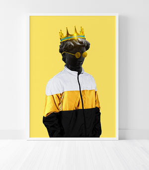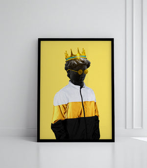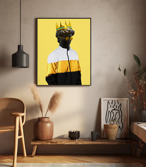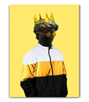 Apportez une touche royale et contemporaine à votre intérieur avec ce tableau audacieux. Ce portrait réimaginé d’une statue classique, coiffée d’une couronne dorée et parée de lunettes de soleil stylées, arbore un look urbain avec un blouson moderne en or et noir. Idéal pour les amateurs de design pop art et de créations décalées, ce tableau vibrant et original transformera vos murs en véritable galerie moderne.