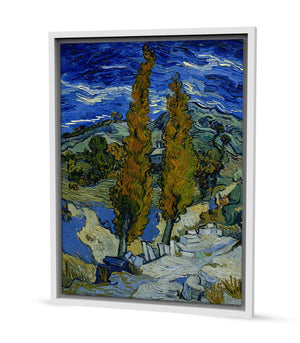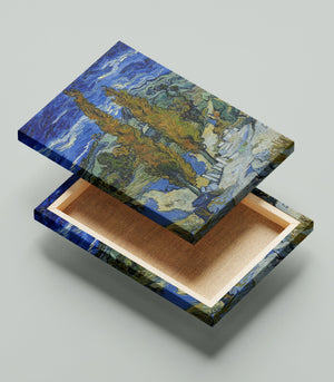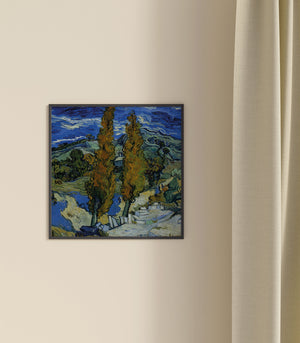 Tableau Cypres sous le Ciel Azur est une œuvre vibrante qui capture l'essence dynamique et tourbillonnante de la nature sous le pinceau impétueux de l'artiste. Les coups de brosse audacieux et les couleurs vivantes créent un paysage en mouvement, où les cyprès s'élancent vers un ciel tumultueux, empreint de nuances bleues et blanches.
