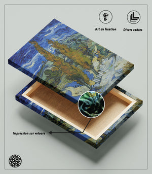 Chaque pièce est soigneusement imprimée sur du velours somptueux, offrant une texture et une profondeur exceptionnelles qui captivent le regard et invitent au toucher. Notre impression sur velours, novatrice et de haute qualité, apporte une dimension luxueuse et contemporaine à nos œuvres, créant ainsi une expérience visuelle inédite.