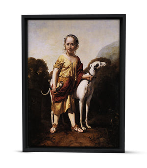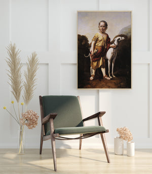 Le tableau "Le Jeune Berger et Son Fidèle Compagnon" est une représentation classique et intemporelle qui illustre la pureté et l'innocence de la jeunesse ainsi que le lien profond entre l'homme et l'animal. Le jeune garçon, vêtu d'une tunique qui rappelle les époques anciennes, tient en laisse un chien blanc, symbole de fidélité et de protection.