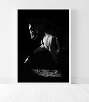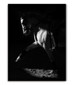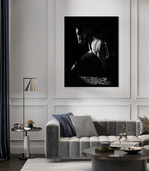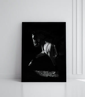 Éclat Nocturne" est une œuvre d'art remarquable qui capture l'image envoûtante d'un cheval blanc en pleine course, immortalisé dans un style photographique noir et blanc. La puissance du cheval est accentuée par le contraste saisissant entre sa robe brillante et l'obscurité environnante, tandis que les jeux de lumière mettent en valeur chaque muscle en mouvement. Cette image dramatique et élégante est parfaite pour les amateurs d'équitation et les amateurs d'art, offrant une fenêtre sur la noblesse et la grâce innées des chevaux. Ce tableau apporte une dimension sophistiquée et un caractère intemporel à tout espace moderne ou classique, faisant écho à la majesté silencieuse de la nature équine.
