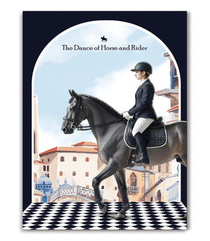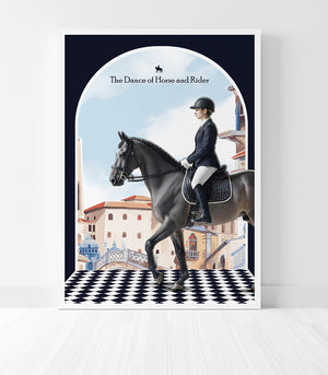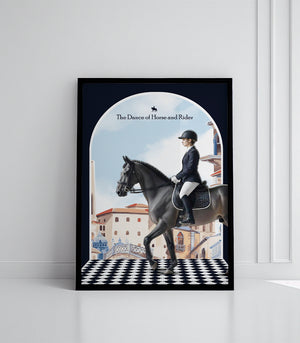 Ce tableau élégant, intitulé "La Danse du Cheval et du Cavalier", capture l'harmonie et la grâce d'un dressage équestre au cœur d'un décor urbain européen. La représentation artistique dépeint un cavalier en tenue classique, guidant son cheval gris avec une précision et une fluidité qui évoquent une danse soigneusement chorégraphiée. L'arrière-plan, caractérisé par des bâtiments stylisés et une perspective accrocheuse sur un damier noir et blanc, ajoute une touche de sophistication visuelle. Cette œuvre célèbre la relation intime entre le cheval et son cavalier, un duo qui se déplace en parfaite symbiose, offrant un spectacle de beauté et d'élégance qui enchante et inspire. Parfait pour les amateurs d'équitation classique ou ceux qui apprécient l'art figuratif raffiné, ce tableau apportera distinction et charme à tout espace de vie moderne ou traditionnel.