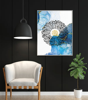 Description: Cette œuvre artistique présente une calligraphie arabe élégante en nuances dorées sur un fond bleu profond. Les caractères calligraphiques sont arrangés en une composition circulaire complexe, évoquant à la fois une étoile et un mandala. La fusion de l'or étincelant sur le bleu riche crée une esthétique visuelle époustouflante. Cette pièce puise dans la tradition de l'art islamique pour créer une représentation contemporaine de la beauté et de la spiritualité. Elle invite à une réflexion sur la signification profonde des mots et de l'esthétique dans la culture arabe et islamique.