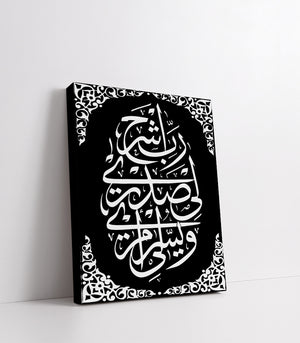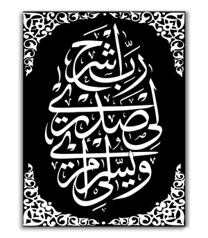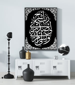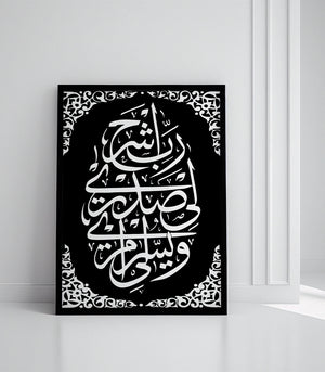 Cet art mural caractéristique présente une calligraphie arabe fluide en blanc sur fond noir, entourée d'une bordure ornée d'éléments décoratifs islamiques. La pièce semble capturer le mouvement et la grâce de l'écriture, chaque caractère étant disposé avec soin pour créer une forme pyramidale ascendante, qui peut être interprétée comme une métaphore de l'élévation spirituelle. Le cadre, richement décoré, rappelle les motifs classiques trouvés dans l'architecture islamique, ajoutant une touche d'élégance et de tradition à la composition moderne. Ce tableau est une célébration visuelle de la foi et de l'art calligraphique.