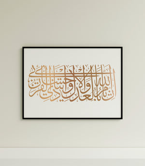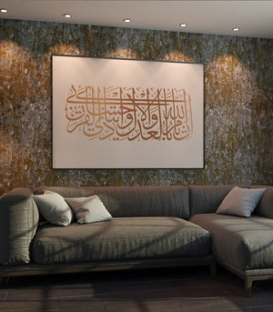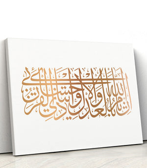 un tableau de décoration qui célèbre la grâce et l'élégance de la calligraphie islamique. Les vers dorés, tracés avec finesse et fluidité sur une toile épurée, évoquent la spiritualité et la poésie qui émanent des textes sacrés.