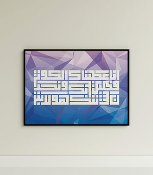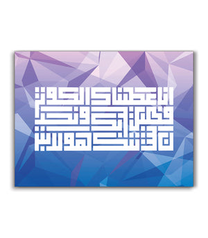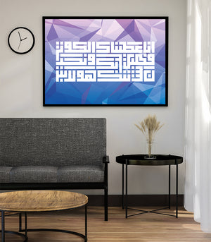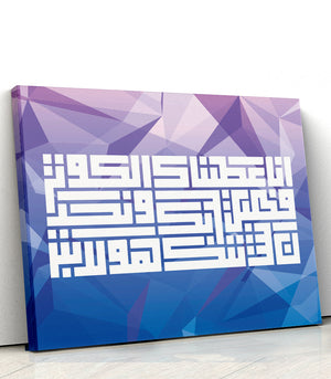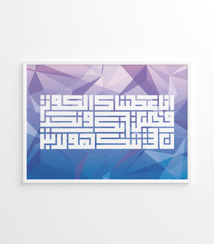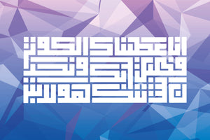 Une interprétation contemporaine de la sourate Al-Kawthar à travers la calligraphie islamique, superposée sur un fond de polygones colorés qui rappelle un prisme. Cette représentation graphique transforme le texte sacré en un motif visuel dynamique, reflétant la diversité et la richesse de la miséricorde divine. Le choix des couleurs et la forme géométrique expriment l'énergie et l'abondance de la sourate la plus courte du Coran, qui symbolise la générosité incommensurable d'Allah envers le Prophète Muhammad.
