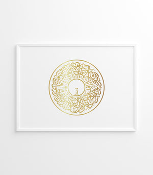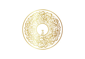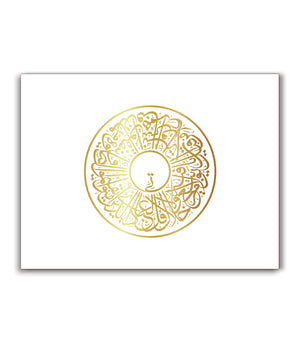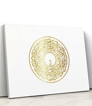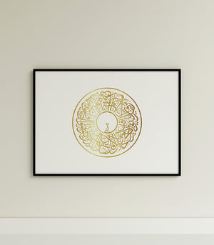 ce tableau est une expression artistique qui utilise l'art de la calligraphie pour représenter visuellement les promesses divines d'harmonie et de paix éternelle, invitant à la contemplation et à l'inspiration spirituelle. La calligraphie, entourée d'une auréole lumineuse sur un fond subtil, symbolise la lumière divine enveloppant les paroles sacrées.