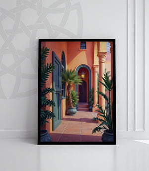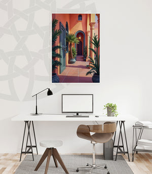 Ce tableau met en valeur la beauté intemporelle d'une entrée méditerranéenne, avec ses arches élégantes, ses plantes tropicales et ses teintes chaleureuses. Les jeux de lumière et d'ombre apportent une profondeur apaisante, transformant cet espace en une invitation à la détente et à l'évasion. Idéal pour habiller un bureau ou une pièce de vie, ce cadre mural apporte une touche raffinée et lumineuse à tout intérieur