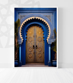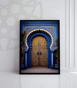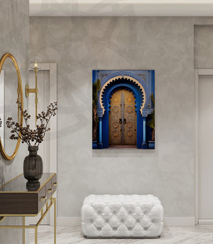 Ce tableau décoratif illustre l'élégance intemporelle de l'architecture marocaine avec une porte dorée richement ornée, encadrée par des mosaïques bleues éclatantes. Symbole de raffinement et d’artisanat, cette œuvre capture la beauté unique de Fès, célèbre pour son patrimoine culturel. Idéal pour sublimer un salon, une entrée ou une salle de réception, ce tableau apporte une touche de sophistication et de charme marocain à votre espace.