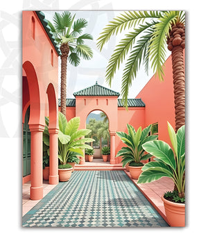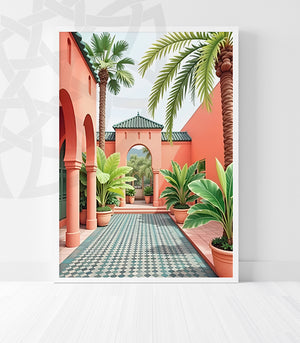 Ce tableau décoratif célèbre la beauté intemporelle du Jardin Secret de la Médina de Marrakech, avec ses arches élégantes, ses palmiers majestueux et ses carreaux en mosaïque raffinés. Les teintes chaudes de terracotta et la végétation luxuriante créent une atmosphère apaisante et invitante. Idéal pour sublimer un salon, une salle à manger ou un bureau, ce tableau transporte votre intérieur au cœur de l’élégance et du charme marocains