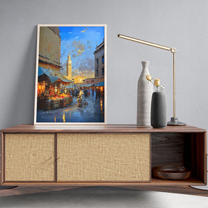 Ce tableau artistique capture une scène de soirée animée dans les rues de Marrakech, près de la célèbre tour de la Koutoubia. Les couleurs vibrantes et la lumière chaude des lanternes des marchands se reflètent sur le pavé mouillé, créant une ambiance mystérieuse et accueillante. Les silhouettes des passants et les volatiles qui s'envolent dans le ciel crépusculaire ajoutent une dynamique de mouvement et de vie. Cette œuvre, riche en détails et en émotions, est un hommage à l'énergie incessante de Marrakech et à son mélange unique de tradition et de modernité. Elle apportera sophistication et profondeur à tout espace contemporain.