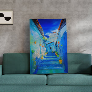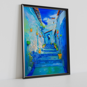 Description : Ce tableau vibrant et coloré nous transporte dans les rues emblématiques de Chefchaouen, la ville bleue du Maroc. Utilisant une palette de couleurs audacieuses, allant du bleu profond aux touches éclatantes de vert, orange, et jaune, cet œuvre capte l'essence vibrante de la Médina. Les marches montantes et les ruelles étroites peintes en bleu cobalt créent une profondeur fascinante et invitent à l'exploration. Ce tableau décoratif marocain est une célébration de la couleur et de la culture, parfait pour ajouter un point focal dynamique à tout espace de vie ou bureau.