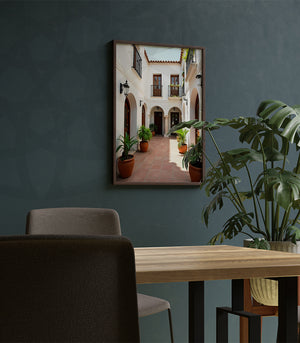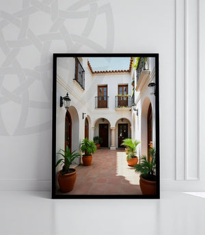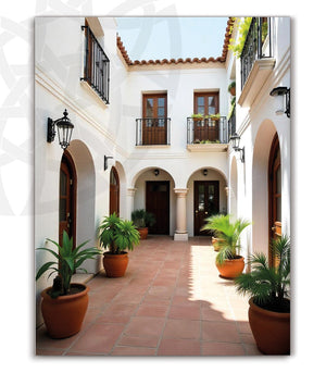 Ce tableau décoratif met en lumière une charmante cour andalouse, avec ses arches élégantes, ses balcons en fer forgé et ses pots en terre cuite garnis de plantes verdoyantes. L’équilibre parfait entre l’architecture blanche et les tons chauds du sol apporte une ambiance méditerranéenne apaisante. Idéal pour décorer une salle à manger, un bureau ou un salon, ce tableau invite à la sérénité et à l’évasion dans un cadre intemporel.