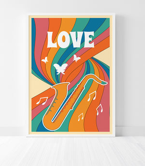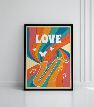 Apportez une ambiance vintage et musicale à votre espace avec cette affiche Love Saxophone de la collection Psyché Love. Avec ses tons chauds et ses motifs ondulés inspirés des années 70, cette pièce respire l'harmonie et la paix. Les notes de musique et les papillons ajoutent une touche de légèreté et de joie, faisant de ce tableau l'élément parfait pour un intérieur aux influences rétro et apaisantes. Que ce soit pour un salon, un studio ou une chambre, cette affiche apportera une touche de couleur et de sérénité.