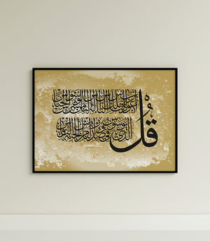 Ce tableau est une interprétation artistique de la sourate An-Nas, qui est une prière invoquant la protection d'Allah contre le mal. La calligraphie est présentée dans un style traditionnel avec des nuances de doré sur fond vieilli, évoquant un sens d'antiquité et de sagesse. Le tableau inspire à la fois un sentiment de paix et une puissante connexion spirituelle, offrant un rappel visuel de la recherche de protection et de réconfort dans la foi.