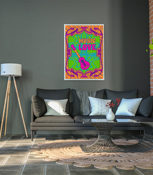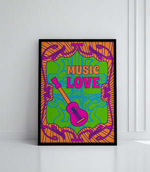 Plongez dans l’univers vibrant des années 70 avec ce tableau décoratif "Music & Love". Sa palette de couleurs psychédéliques et son motif de guitare évoquent une époque de liberté et de passion musicale. Parfait pour les amateurs de vintage et de décoration originale, ce cadre égayera votre salon, chambre ou espace créatif avec une touche d'énergie rétro et de positivité.