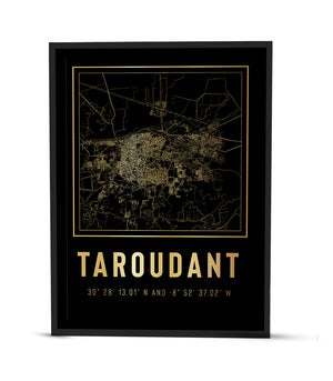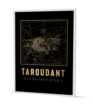 Ce tableau dépeint avec finesse le cœur historique de Taroudant, entouré de ses murailles légendaires, au travers d'une cartographie épurée où les lignes claires se détachent sur le fond sombre, évoquant le réseau complexe des ruelles et des remparts de la ville. L'alliance de l'art décoratif et de la précision cartographique fait ressortir le caractère historique et intemporel de Taroudant, créant un jeu de contrastes entre lumière et ombre. Cet ouvrage n'est pas qu'une simple décoration, c'est un morceau d'histoire qui apporte une élégance ancienne à un intérieur moderne.