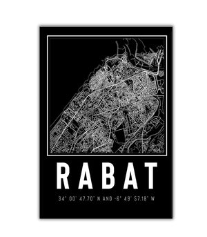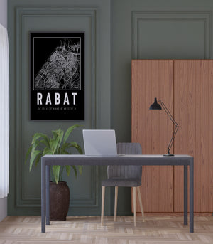 Ce tableau décoratif en noir et blanc présente la ville de Rabat avec une élégance graphique et une précision méticuleuse. La carte détaillée dévoile la structure complexe de la capitale marocaine, depuis les rives du Bouregreg jusqu'aux remparts de l'ancienne médina. Chaque ligne, chaque avenue, et chaque parcelle de terrain est représentée avec soin, offrant une vue aérienne fascinante de la ville.