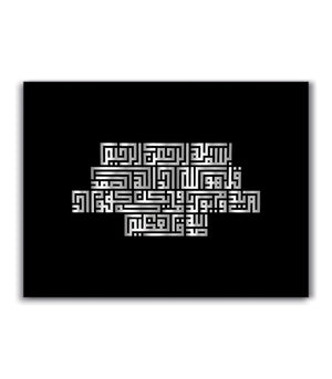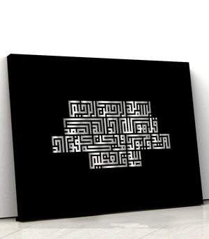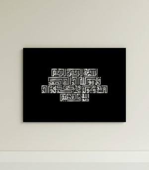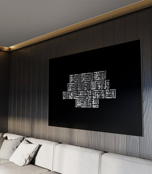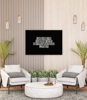Cette œuvre présente une calligraphie arabe moderne en blanc sur fond noir, composée dans un style géométrique carré Kufique. Les lignes nettes et les formes angulaires de la calligraphie créent un motif labyrinthique qui joue sur l'espace négatif, rendant la lecture du texte à la fois un défi visuel et une expérience artistique. Ce style minimaliste mais complexe est un hommage à la tradition calligraphique, tout en offrant une interprétation contemporaine qui s'intégrerait parfaitement dans un intérieur moderne. C'est une célébration de l'ancien langage artistique dans un contexte de design actuel.