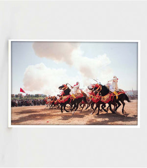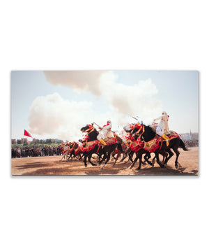 Idéal pour ceux qui apprécient l'art équestre ou souhaitent ajouter une touche d'élégance marocaine à leur décor, ce tableau est une célébration de la tradition et de la modernité. Il offre un voyage visuel à travers le temps, rendant hommage à la tbourida, non seulement comme un événement sportif, mais aussi comme un spectacle vivant d'histoire et de passion.