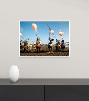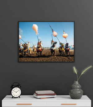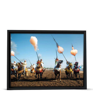 Idéal pour ceux qui apprécient l'art équestre ou souhaitent ajouter une touche d'élégance marocaine à leur décor, ce tableau est une célébration de la tradition et de la modernité. Il offre un voyage visuel à travers le temps, rendant hommage à la tbourida, non seulement comme un événement sportif, mais aussi comme un spectacle vivant d'histoire et de passion.