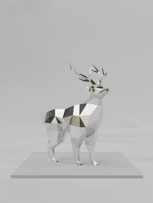 Évocation de la noblesse sauvage, cette sculpture de cerf en style polygonal capte l’essence de l’animal emblématique de la forêt avec un langage géométrique contemporain. Ses lignes tendues et ses angles nets traduisent la puissance silencieuse et la posture altière du cerf en pleine alerte.