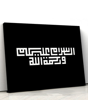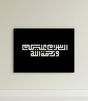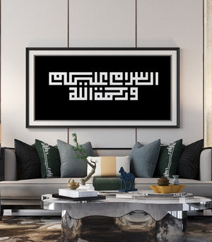 Ce tableau présente une calligraphie arabe Kufique, caractérisée par des lignes droites et des formes géométriques. L'esthétique épurée et moderne de la calligraphie est accentuée par le fort contraste entre le noir et le blanc.