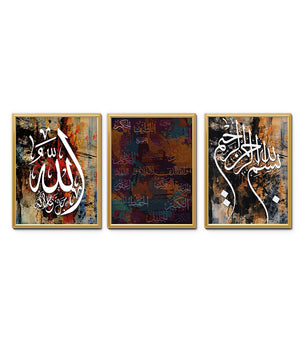 Ce tableau triptyque combine la richesse de la calligraphie islamique avec un design moderne et des couleurs vibrantes. Les panneaux latéraux mettent en valeur des inscriptions significatives, tandis que le panneau central regorge de noms divins dans un agencement artistique. Les tons chauds et les motifs abstraits ajoutent une touche contemporaine et spirituelle, idéale pour sublimer un espace intérieur tout en reflétant une ambiance sereine et profonde.