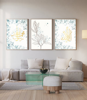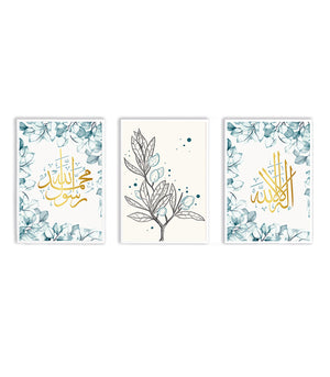 Ce tableau décoratif triptyque reflète l'essence de l'art islamique à travers une combinaison harmonieuse de calligraphie dorée et de motifs floraux délicats. Les inscriptions des panneaux latéraux honorent "Allah" et "Mohammed" , tandis que le panneau central, avec son design botanique minimaliste, évoque la sérénité et l'élégance. Un chef-d'œuvre parfait pour apporter une ambiance spirituelle et raffinée à votre intérieur.