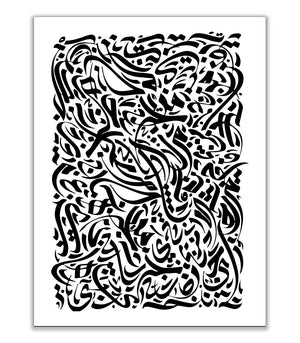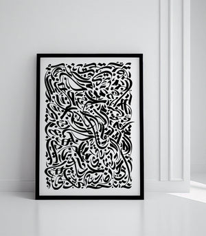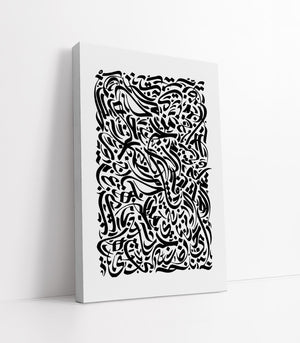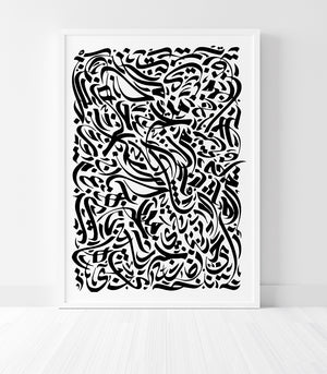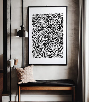 Le tableau est un exemple captivant d'art abstrait qui utilise la calligraphie pour créer une composition dense et complexe. La calligraphie, ici en noir sur un fond blanc, semble être disposée sans suivre un ordre linéaire, formant un réseau de lignes entrelacées qui attirent l'œil et invitent à l'exploration.