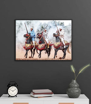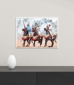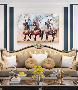 Idéal pour ceux qui apprécient l'art équestre ou souhaitent ajouter une touche d'élégance marocaine à leur décor, ce tableau est une célébration de la tradition et de la modernité. Il offre un voyage visuel à travers le temps, rendant hommage à la tbourida, non seulement comme un événement sportif, mais aussi comme un spectacle vivant d'histoire et de passion.
