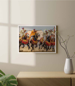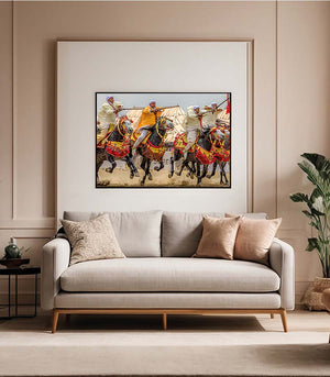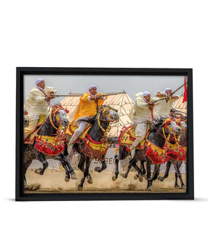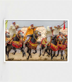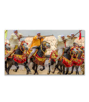 Idéal pour ceux qui apprécient l'art équestre ou souhaitent ajouter une touche d'élégance marocaine à leur décor, ce tableau est une célébration de la tradition et de la modernité. Il offre un voyage visuel à travers le temps, rendant hommage à la tbourida, non seulement comme un événement sportif, mais aussi comme un spectacle vivant d'histoire et de passion.