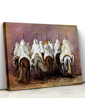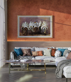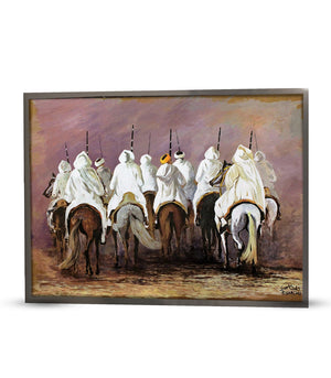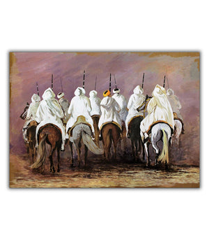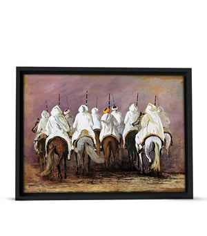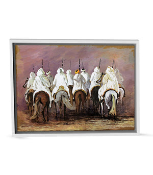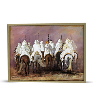 Idéal pour ceux qui apprécient l'art équestre ou souhaitent ajouter une touche d'élégance marocaine à leur décor, ce tableau est une célébration de la tradition et de la modernité. Il offre un voyage visuel à travers le temps, rendant hommage à la tbourida, non seulement comme un événement sportif, mais aussi comme un spectacle vivant d'histoire et de passion.