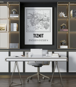 Ce tableau décoratif présente la cartographie urbaine de Tiznit, une ville historique du Maroc. Chaque ligne et chaque détail cartographique mettent en valeur la structure unique de la ville, des remparts historiques aux ruelles pittoresques. Cette représentation artistique invite à explorer l'authenticité et le charme de Tiznit, où le passé et le présent se rejoignent harmonieusement.