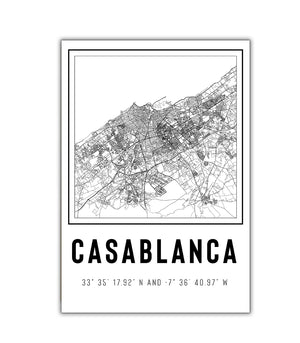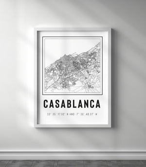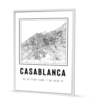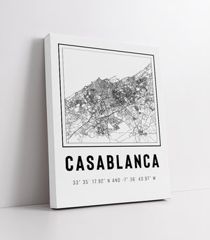Ce tableau décoratif illustre les méandres urbains de Casablanca, la métropole dynamique du Maroc. Chaque ligne et chaque détail cartographique révèlent la complexité et la modernité de cette ville emblématique. Les tracés des rues, des quartiers et des principaux sites sont représentés avec précision, offrant une vue panoramique saisissante de Casablanca.