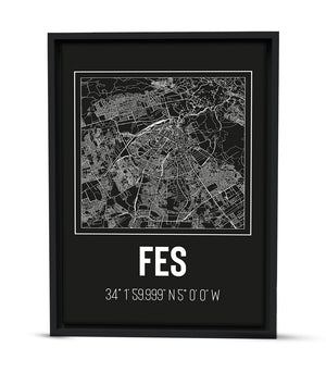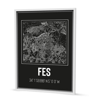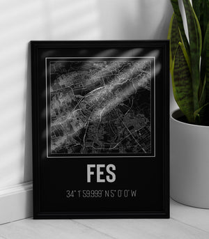 Ce tableau décoratif en noir et blanc met en scène le plan labyrinthique de Fès, reflétant l'enchevêtrement historique des ruelles et des marchés qui caractérisent cette ville impériale. Les lignes claires et précises tracées sur fond sombre offrent un contraste saisissant qui capte l'œil et intrigue l'esprit. La représentation détaillée permet d'apprécier la complexité du tissu urbain de Fès, tandis que les coordonnées géographiques soulignent son emplacement unique au cœur du Maroc. Idéal pour ceux qui chérissent la cartographie et l'architecture, ce tableau est une célébration de la tradition et de la modernité, une pièce maîtresse pour tout intérieur.
