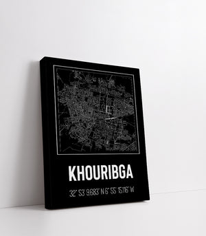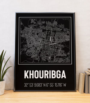 Ce tableau décoratif est une célébration de l'urbanisme de Khouribga, représentée par des lignes blanches nettes sur un fond noir intense. La composition met en exergue la disposition fascinante de cette ville marocaine, avec ses quartiers, ses rues et ses intersections qui racontent l'histoire de son développement au fil du temps. Les coordonnées soigneusement inscrites en blanc ajoutent un élément de précision géographique, invitant le spectateur à explorer non seulement la beauté esthétique de la pièce, mais aussi la richesse culturelle et historique de Khouribga. Ce tableau est parfait pour ceux qui cherchent à intégrer un élément d'intérêt visuel et culturel dans leur espace de vie ou de travail.