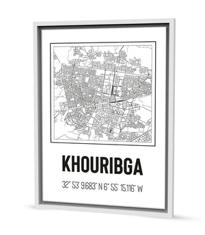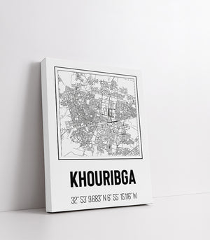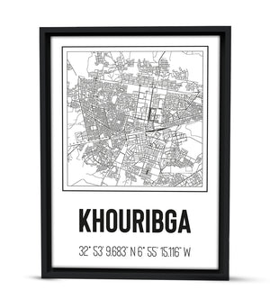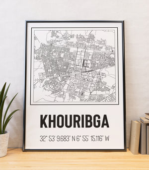 Ce tableau décoratif en noir et blanc est une célébration graphique de Khouribga, une ville emblématique du Maroc connue pour son riche passé minier. Il dévoile avec une élégante simplicité la complexité des rues et des quartiers, capturant l'essence urbaine de la ville dans un style minimaliste. Les lignes nettes et la clarté des tracés font écho à l'ordre et à la structure de Khouribga, tandis que les coordonnées géographiques inscrites en bas ajoutent un détail fonctionnel à l'œuvre. Ce tableau est idéal pour ceux qui apprécient l'art de la cartographie et qui cherchent à incorporer un élément de design architectural dans leur espace.