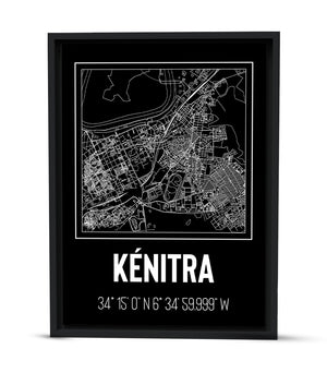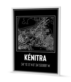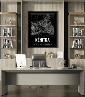 Ce tableau décoratif est une célébration de la topographie de Kénitra, magnifiquement rendue par des lignes blanches qui se détachent sur un fond noir intense. Les tracés lumineux invitent le spectateur à explorer visuellement la complexité des rues et des infrastructures de la ville. Cette œuvre est non seulement décorative mais aussi un hommage à l'urbanisme de Kénitra, soulignant avec élégance les formes et les textures qui caractérisent son paysage urbain. Les coordonnées géographiques en bas du tableau servent de guide précis et enrichissent l'aspect esthétique global, offrant une pièce de conversation distinctive pour tout espace contemporain.