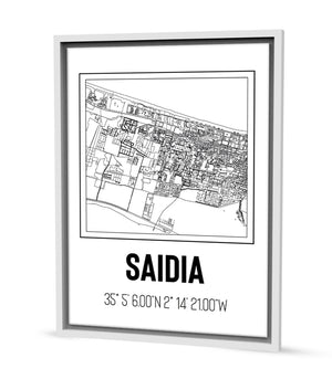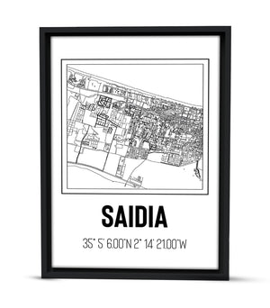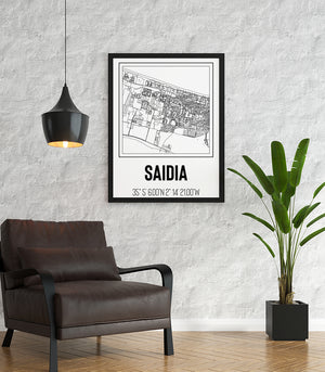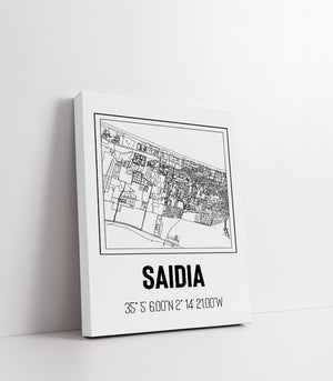 Ce tableau décoratif révèle la disposition urbaine de Saïdia, présentée dans un style linéaire et épuré qui souligne la structure de la ville. Les tracés délicats sur un fond blanc pur offrent une perspective claire et artistique des rues et quartiers, invitant à l'observation et à l'appréciation de la géographie urbaine. La simplicité de la palette de couleurs en noir et blanc confère à cette pièce une polyvalence décorative, capable de s'adapter à tout espace ou style de décoration. En dessous, les coordonnées géographiques précises ajoutent une touche d'authenticité et de connexion au monde réel, faisant de ce tableau un élément de décoration unique et significatif.
