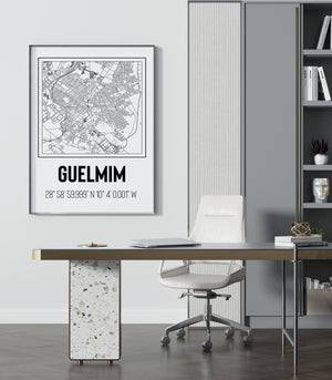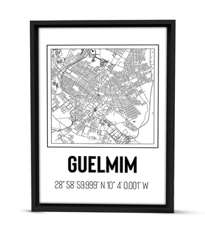 Ce tableau décoratif dévoile avec élégance le réseau urbain de Guelmim. Chaque ligne et chaque espace sont tracés avec soin, reflétant la structure complexe et harmonieuse de la ville. L'esthétique en noir et blanc renforce le caractère graphique de la carte, offrant une œuvre d'art qui est à la fois informative et stylisée. La présence des coordonnées géographiques en bas renforce l'ancrage de cette représentation artistique dans la réalité concrète du lieu. Cet objet d'art est parfait pour toute personne désirant apporter une dimension cartographique sophistiquée à son espace de vie ou de travail.